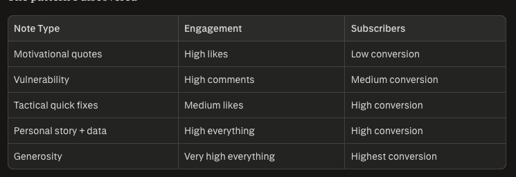 After 1,400+ Notes, I’ve identified 7 formats that I rotate. Tactical “quick fix” Notes and personal-story-with-data Notes drive the most subscribers (not just likes). Motivational quotes get engagement but rarely convert. The key insight: entertainment gets likes; education gets subscribers; generosity gets both.